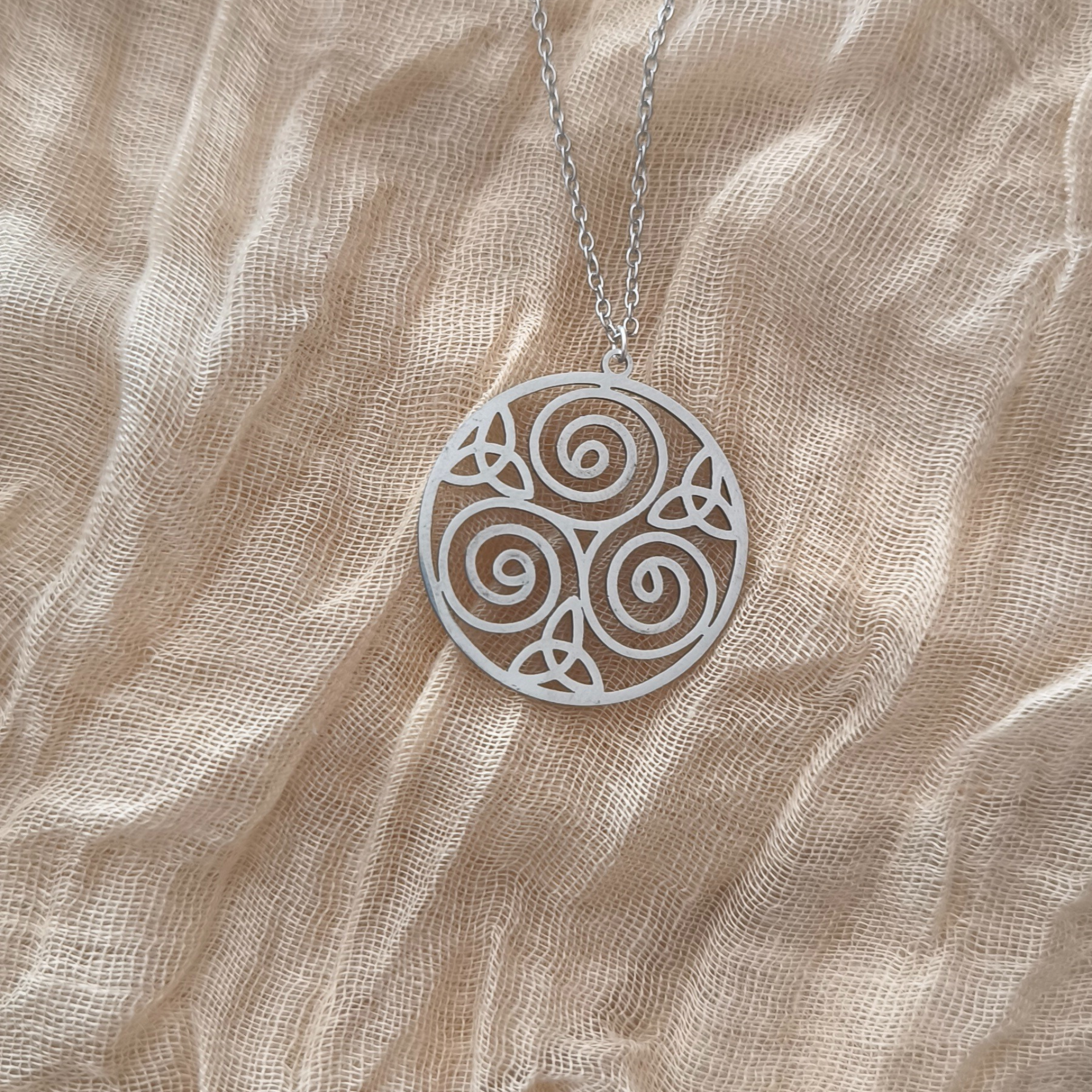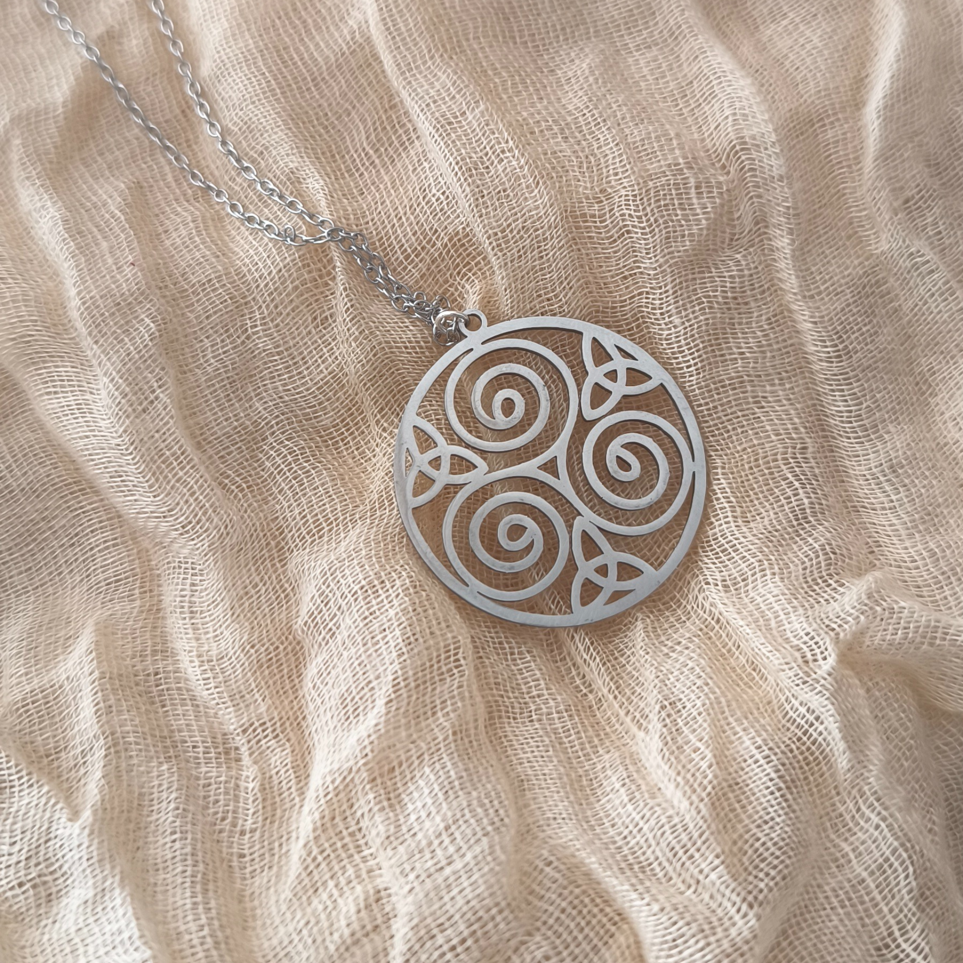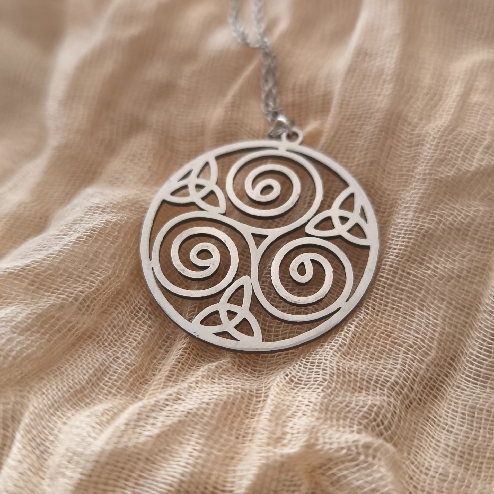 Círculo Druida es un símbolo muy potente: las tres espirales son un antiguo símbolo en Europa que simboliza el ciclo de nacimiento, vida y renacimiento, además de la evolución personal, la conexión contigo misma y tu fuerza para seguir avanzando. Las tres tisquetas son una protección triple, y el círculo que lo rodea todo hace de protección tanto para el resto de símbolos como para ti misma, conteniendo toda la energía de este poderoso amuleto.